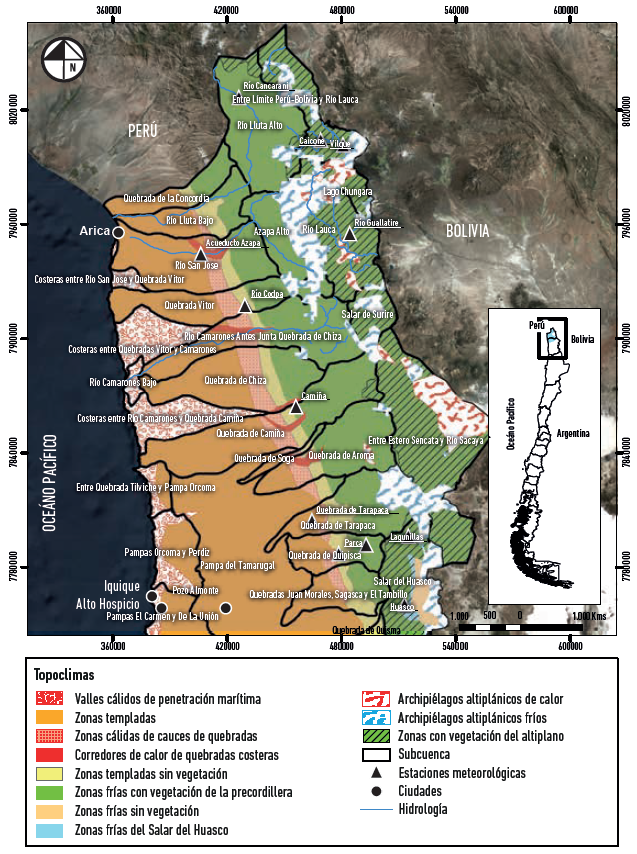 Para la interpretación de las principales formas naturales, se construyó un sistema de información geográfica que incluyó los rasgos topográficos e hidrográficos a escala de subcuencas, y se determinaron las exposiciones de barlovento para las influencias del Monzón Amazónico, responsable de las lluvias estivales en esta zona del país. También se incluyeron capas de información correspondientes a la localización de las áreas de conservación de la naturaleza (parques nacionales, reservas y monumentos naturales), por parte de las comunidades indígenas, con las que se interactuó a través de talleres, grupos focales, entrevistas y cartografía participativa. La localización de las actividades económicas por sectores fue obtenida de los estudios de impacto ambiental disponibles en el servicio estatal a cargo de ello, mientras que la localización de caudales de extracción de aguas subterráneas fue proporcionada por la Dirección General de Aguas del Ministerio de Obras Públicas de Chile.