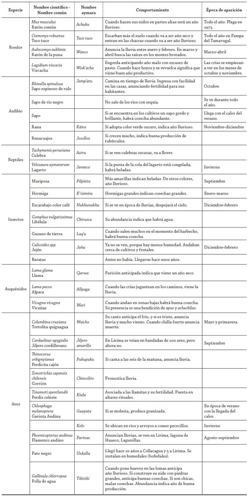 Tabla 1: Animales que son “señaleros” o anticipan el comportamiento de los climas en las comunidades de Tarapacá, norte de Chile