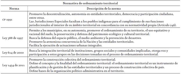 Además de la movilización de los Consejos Comunitarios por el reconocimiento de su organización social y, en el caso de El Tiple, de un territorio colectivo, también las comunidades participan de los espacios institucionales dispuestos para la planeación territorial. A continuación, la Tabla 2 describe el grupo de normas que sustentan la planeación y el ordenamiento territorial en el caso de Colombia.