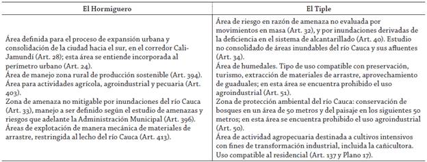 Los instrumentos técnicos vigentes que han buscado desde los gobiernos municipales ordenar los territorios de Santiago de Cali y Candelaria son la "Revisión ordinaria de contenido de largo plazo del Plan de Ordenamiento Territorial de Santiago de Cali" (Acuerdo n.° 373 de 2014) y la "Revisión Excepcional al Plan Básico de Ordenamiento Territorial (PBOT) de Candelaria" (Acuerdo n.° 002 de 2015), respectivamente. Además de definir las actividades residenciales de tipo rural, en ambos instrumentos se priorizan los usos productivos sobre el territorio, en particular los usos de tipo agroindustrial; también estos instrumentos han formalizado los procesos de expansión urbana y metropolización de la ciudad de Cali (Rubiano Sánchez y Bolaños Salazar 2012). A continuación, la Tabla 3 sistematiza las principales clasificaciones, usos y definiciones del suelo relevantes al ordenamiento ambiental y productivo de los corregimientos de El Hormiguero y El Tiple según los instrumentos de OT analizados.