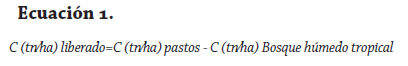 Yepes et ál. (2011) exponen que para determinar la cantidad de carbono liberado por deforestación (toneladas por hectárea - tn/ha), es necesario que al contenido de carbono por hectárea de otras coberturas (en este caso el de pastos limpios) se le reste el contenido de carbono por hectárea de bosque natural. El resultado será un valor negativo a partir de la aplicación de la ecuación 1: