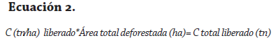 Teniendo el contenido de carbono liberado de una hectárea por deforestación (tn/ha), se puede calcular el carbono total liberado de un área específica en un periodo de tiempo determinado, así (ecuación 2):
