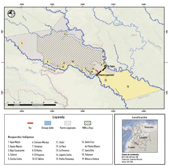 Fue así como comenzó a transformarse la selva, desde Puerto Leguízamo hasta La Tagua, en un cinturón de potreros, añadiendo que para la década de los cincuenta comenzaron a llegar colonos de Tolima, Santander, Norte de Santander y Antioquia, huyendo de la violencia bipartidista a incorporándose en la extracción de maderas, especialmente la del cedro (Cedrela odorata) (Polanco 2013). Esta actividad se extendió fuertemente la década siguiente y fue paulatinamente desapareciendo hacia la década de los ochenta, cuando llegan más colonos al Caucayá a cultivar coca (Erythroxylum coca). Como señalan Palacios y Safford (2002), esta migración se debió principalmente al fracaso de las políticas de reforma agraria en el centro del país, que alentó un frente de colonización más amplio tanto del piedemonte amazónico como del bajo amazonas, del Caquetá y del Putumayo, además de otras regiones del país olvidadas por el Estado colombiano. Durante esta década también se estableció el Parque Nacional Natural La Paya (1984) y la mayoría de los resguardos indígenas que actualmente se encuentran consolidados en el municipio de Puerto Leguízamo (1987-1988) (figura 1).