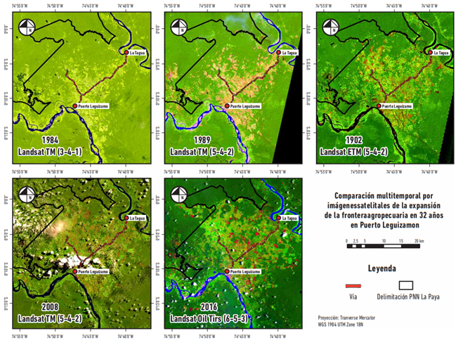Ahora, para el caso de Puerto Leguízamo, desde la década de los noventa el territorio ha estado marcado por una constante deforestación para implementar sistemas productivos de ganadería extensiva, lo que marca un hito trascendental del cambio y desconexión ecológica, por la alta deforestación para la implementación de pastos limpios. Es importante resaltar que las vías tienen una directa incidencia en la fragmentación de los bosques, ya que los proyectos de infraestructura vial incentivan el cambio de cobertura y uso del suelo, tal como se puede observar en la figura 2, donde mediante imágenes satelitales multitemporales se puede observar: 1) el eje carreteable como la base de la transformación, 2) el comienzo de la fractura ecológica de ecosistemas amazónicos en el bajo Putumayo, y 3) la invasión de la frontera agropecuaria en áreas de protección, como lo es el Parque Natural La Paya durante la última década.