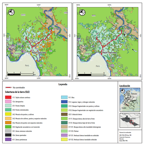 Para el presente estudio se delimitaron 121.537 ha (figura 3), localizadas en el margen de la vía que conecta los centros urbanos de Puerto Leguízamo y La Tagua, usando la información georreferenciada de Coberturas de la Amazonía colombiana de los años 2002 y 2016, brindada por el SIAT-AC y el Instituto SINCHI.