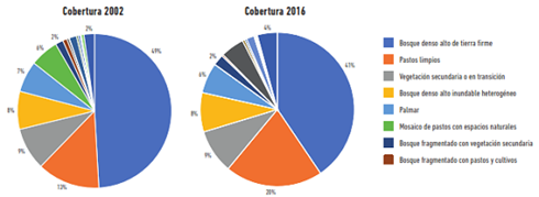 En las gráficas de la figura 4 y la tabla 2 se puede observar explícitamente que la deforestación se realiza primordialmente para el establecimiento de pastos limpios y se expresa no solo en la pérdida de bosque denso, sino también en la drástica disminución de la cobertura de mosaico de pastos con espacios naturales. Por otro lado, el bosque inundable no presenta pérdida, de lo que se infiere que no es de interés su conversión a alguna actividad productiva, y lo mismo se podría inferir respecto de la cobertura de palmar, pues su pérdida en términos porcentuales no es significativa. Con este análisis se puede concluir que las principales coberturas vegetales vulnerables a perderse son las que se encuentran en tierra firme, ya que las zonas de inundación no son de interés para el establecimiento de sistemas productivos por parte de la población. Así mismo, también se deduce que el sistema productivo principal es la ganadería, con un enfoque extensivo y no silvopastoril.