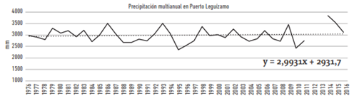 Con este contexto, se exponen a continuación las características de la precipitación y temperatura de Puerto Leguízamo. El régimen anual de precipitación allí es monomodal, con época de lluvias y menor temperatura en los meses de mayo a julio, lo cual coincide con el paso de la ZCIT en la región y los altos niveles del río Putumayo (figuras 5 y 6). El promedio de precipitación anual es de 2.990 mm y el de temperatura de 25,7 °C.
