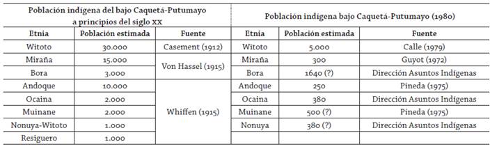 Antes de la llegada del hombre blanco a este territorio, según Pineda (1987), se estima que habitaban estas tierras cerca de 100.000 personas, pertenecientes a ocho comunidades indígenas con diferentes linajes locales. Vivían en malocas o casas colectivas ubicadas a cierta distancia de la ribera de grandes y pequeños ríos, protegiéndose de plagas, inundaciones y eventuales enemigos. Aunque los datos tienen un alto nivel de incertidumbre, debido a la precariedad censal en el siglo XX, se calcula que durante las primeras ocho décadas de ese siglo la población indígena había disminuido en más del 85% (tabla 1).