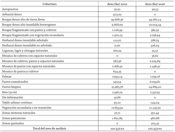 Tabla 2: Cambio de cobertura y uso del suelo en hectáreas en el periodo 2002-2016 en el área de estudio