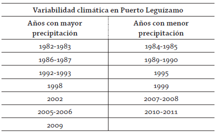 Tabla 3: Años de mayor precipitación (coincide con épocas de Niño) y años de menor precipitación (coincide con épocas de Niña)