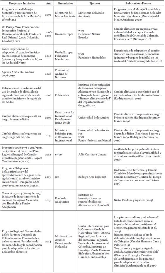 Es preciso aclarar que el conocimiento experto no solo se consolida en las comunicaciones nacionales, sino en una oleada de investigaciones dedicadas al tema. A partir de la primera comunicación se incrementa la cantidad de proyectos y publicaciones dedicados a ecosistemas de alta montaña, la gran mayoría financiados con recursos de cooperación internacional (Tabla 1).