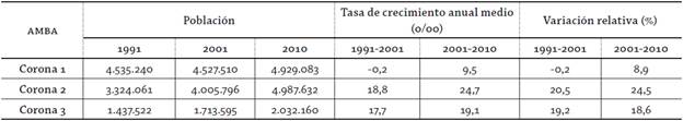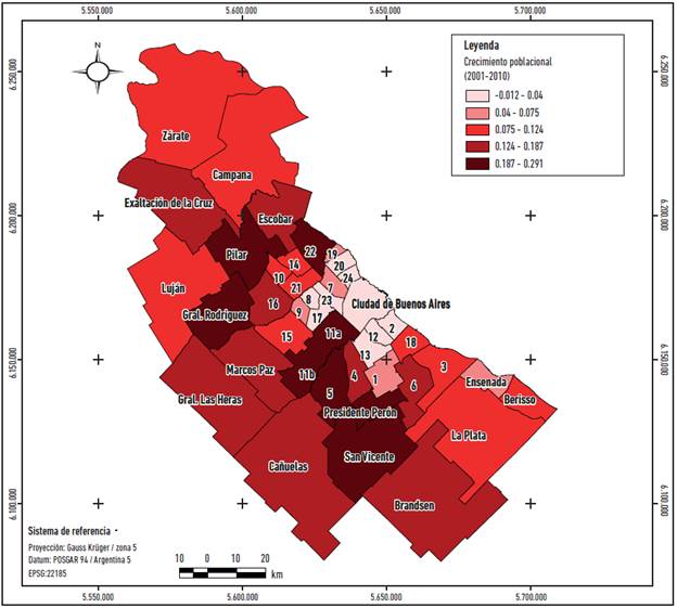 Los datos recién mencionados para la distribución se corroboran al estudiar la variación intercensal de la población por partido durante el periodo 2001-2010. En síntesis, se advierte que los principales crecimientos demográficos se registran especialmente en los partidos de la segunda y tercera corona. Así, los partidos de la primera corona sostienen los mismos niveles poblacionales en términos relativos, mientras que los partidos de la segunda encabezan el crecimiento poblacional en valores absolutos y relativos (Fernández 2011).
