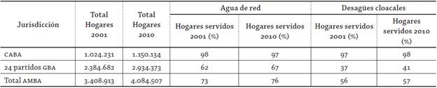 Tabla 1: Hogares con cobertura de agua potable y cloacas en el AMBA (2001-2010)