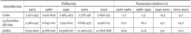Al desagregar los datos, es posible advertir que la población de la CABA se mantuvo prácticamente estable durante las últimas décadas, en un valor histórico de aproximadamente tres millones de habitantes (aunque en el último periodo intercensal se registra un leve incremento de 114.013 habitantes). Esto implica que el crecimiento del AMBA se explica principalmente por el aumento de la población de los veinticuatro partidos del Gran Buenos Aires. En el periodo 2001-2010 la población que allí habita se incrementó en 1.232.278 habitantes, mostrando una variación relativa de 14,2% (superior a la del conjunto del AMBA). Ahora bien, este crecimiento no se dio de manera uniforme en los veinticuatro partidos que integran el Gran Buenos Aires.