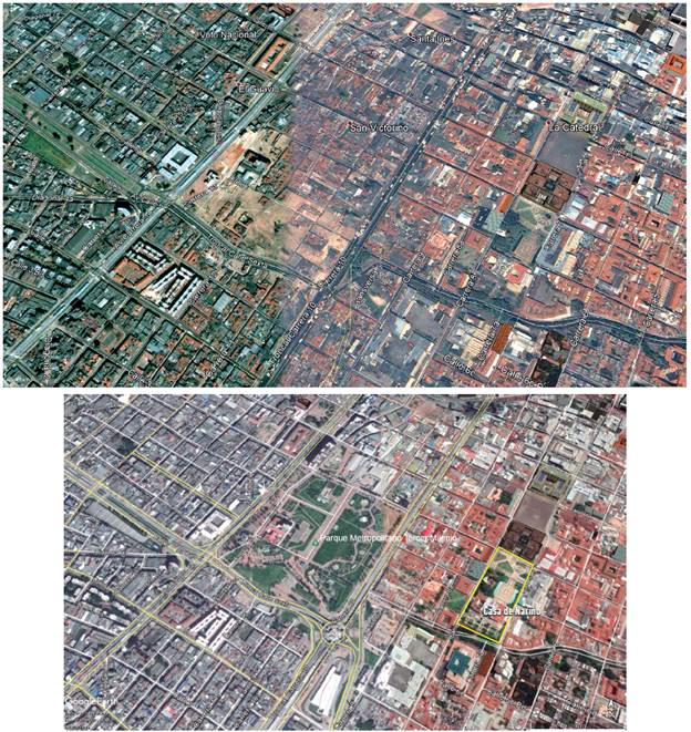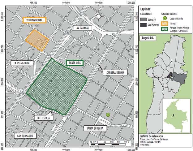 Si bien la antigua Calle del Cartucho y la ya extinta Calle del Bronx se encontraban en dos contextos espacio-temporales diferenciados, las dinámicas de esta dupla de territorios toporrepresentados con miedo presentan similitudes tanto por sus contextos históricos, como por el entrelazamiento de la herencia del uno hacia otro. La Calle del Cartucho, hacia la década de los setenta, inicialmente se encontraba en el eje de la emblemática Avenida Caracas entre las calles 10 y 9, desde donde se extendió progresivamente a todo el antiguo barrio Santa Inés, de la localidad de Santa Fe. Posteriormente, ocurre su destrucción, producto de la masificación del discurso institucional, policial y vecinal de la necesidad de "eliminarlo" física y simbólicamente, por ser el nicho generador de gran parte de la inseguridad urbana de Bogotá, como lo documenta Cardeño (2007). Luego, se configura la Calle del Bronx entre las mismas calles 9 y 10, pero un par de manzanas al occidente, entre las carreras 15 y 15 A, en el barrio Voto Nacional, ubicado en la localidad de Los Mártires, hacia la primera década del siglo XXI (Figura 1).