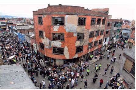 En ese sentido, la Calle del Bronx se constituyó como una combinación de las categorías mencionadas: estructuras urbanas en malas condiciones (Figura 2); terrenos invadidos por habitantes de calle; infraestructura construida con materiales precarios que se alzaba sobre las aceras con el fin de brindarle a los consumidores de droga un refugio temporal (Figuras 2 y 3); altas tasas de homicidios y robos a mano armada. Se consolidó el entrecruzamiento de fenómenos e historias, como si fuese una repetición del Cartucho, para generar de esta manera un espacio de miedo cuyo "reconocimiento" era de carácter colectivo, es decir, una toporrepresentación profundamente nefasta.