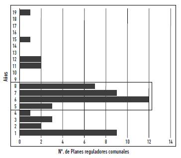 Junto con lo anterior también existen antecedentes que indican que las aprobaciones de los PRC demoran más tiempo de lo planificado: "los periodos de tramitación para la formulación o modificación de los planes reguladores [son extensos], en promedio tardan más de seis años" (Giménez y Ugarte 2014, 69). En la Figura 1 se observa un gráfico que muestra los años que tardan algunos PRC en su proceso de aprobación. Según Giménez y Ugarte (2014) estos debieran demorarse entre uno y dos años, pero la media se sitúa entre los seis y siete años, así como hay algunos casos extremos donde un PRC demoró diecinueve años en aprobarse.