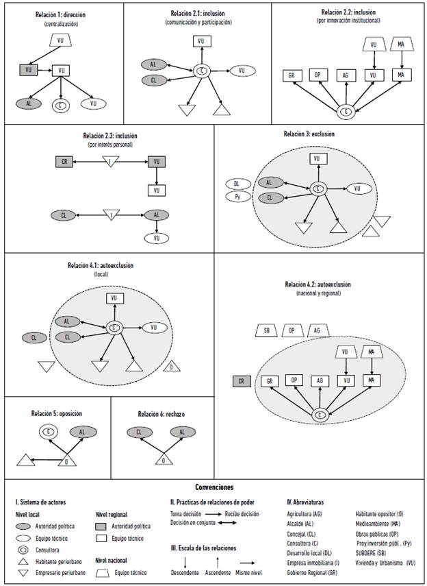 Además, se resalta un caso particular en la manera de actuar de un tipo de actor: los promotores inmobiliarios. Aquí se cumple lo indicado por Anderson y Hill (2004), quienes plantean que algunos empresarios movilizan sus recursos para crear o modificar reglas de las instituciones y favorecer así sus propios intereses. En esta SDG se aprecia que ellos no participaron directamente de las instancias de participación ciudadana, sino que se contactaron directamente con las autoridades locales. De este modo, se constata que las instituciones pueden plantear direcciones o restricciones a las prácticas de los actores, pero no determinan el comportamiento de estos, ya que ellos se mueven según sus intereses (Pacheco et ál. 2010). A partir del uso del concepto de actor, también se reflexiona en torno a la siguiente inquietud: ¿Por qué es mejor utilizar el concepto de actor que el de agente en esta investigación? Según Giddens (2006), los agentes son personas u organizaciones que se desenvuelven bajo estructuras sociales y responden a las posibilidades que dichas estructuras les otorgan. Según Bourdieu (2000) y Touraine (2002) el agente desarrolla prácticas acordes con las estructuras; en cambio el concepto de actor amplía los límites de acción de las personas y organizaciones más allá de las estructuras (Fernández 2003). Por lo tanto, el concepto de actor armoniza mejor con la presente investigación, ya que lo actores rompen la tendencia de las estructuras, lo cual queda demostrado en las últimas tres relaciones de poder: la autoexclusión, la oposición y el rechazo.