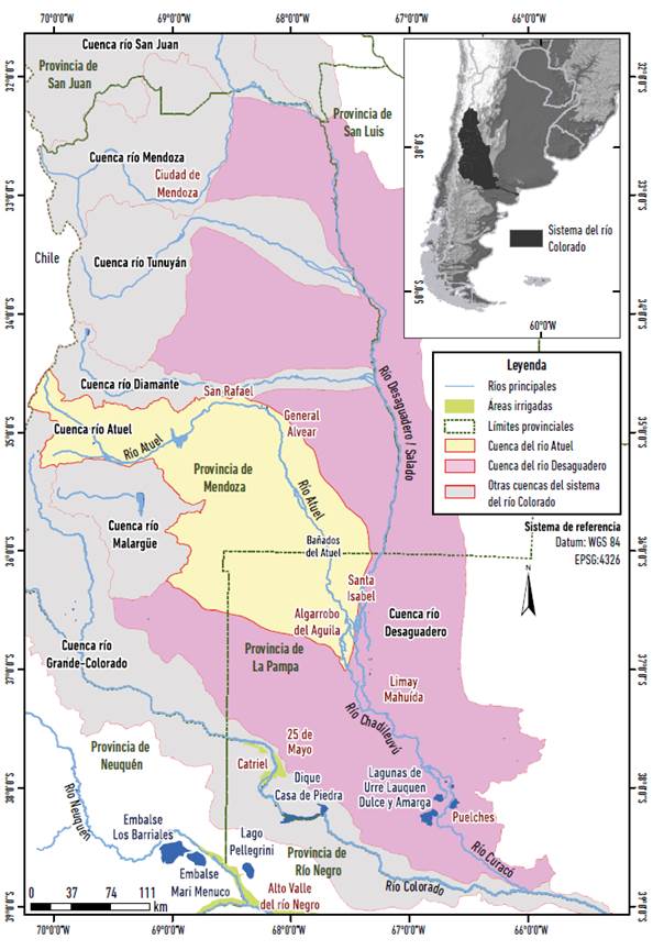 Figura 1: Área de estudio, las cuencas de los ríos Atuel y Desaguadero, en el sistema río Colorado.
