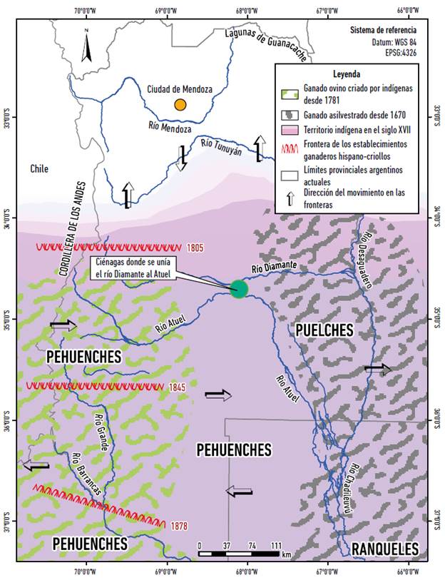 Figura 2: Cambios en la frontera y asentamientos indígenas en Mendoza, entre 1670-1878.