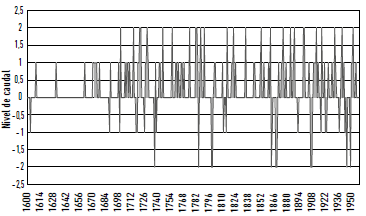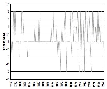 La validez de los datos se verifica a partir de una rigurosa crítica documental, incorporando la técnica de análisis de contenido, que permite derivar datos climáticos desde documentos históricos, además de ayudar a interpretar y cuantificar los procesos climáticos en general. El conocimiento histórico, cultural y geográfico de las tensiones, intereses y contextos particulares de cada fuente documental es imprescindible para interpretar adecuadamente las perspectivas narrativas y los datos allí presentes (sean archivos militares, comerciales, científicos o religiosos). Una vez realizada la interpretación cualitativa de los datos, esta se traslada a niveles ordinales que van a permitir realizar análisis estadísticos y comparaciones con series paleoclimáticas provenientes de otras fuentes (Moodie y Catchpole 1975; Baron 1982; Prieto y García Herrera 2009). La reconstrucción resultante se expresa a través de una "línea de tendencia" de la variabilidad de los caudales del río Atuel (1776-1946). Utilizando los indicadores señalados, se determinó una escala de cinco categorías: crecidas extraordinarias (2), crecida (1), caudal normal (0), bajo caudal (1), y caudal extremadamente bajo (-2). En este caso no se construye una serie, como suele hacerse en climatología histórica con un método similar, pues los datos existentes son insuficientes. A posteriori, se comparó esta línea de tendencia con la información provista por otras disciplinas, tales como la dendrocronología, la glaciología y la meteorología. Por último, se realizó una interpretación cualitativa -final- de las fuentes documentales, pero -en este caso- considerando la reconstrucción y las comparaciones realizadas en el paso anterior.