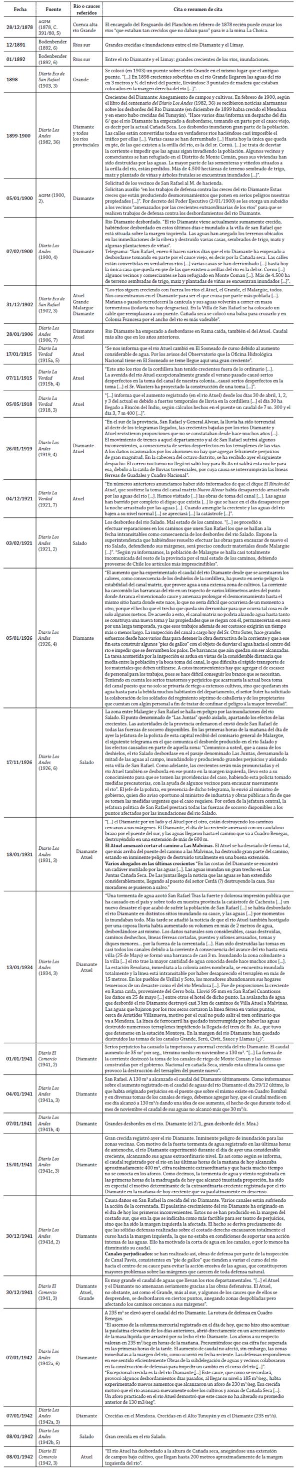 En el Anexo 1 (crecidas extraordinarias, inundaciones, crecientes y desbordes en los ríos del sur mendocino entre 1878 y 1942) se puede observar que las crecidas extraordinarias no responden por lo general a una sola causa, fusión de la nieve o lluvias torrenciales, sino que en varias ocasiones han tenido su origen en periodos de fuerte deshielo combinado con intensas lluvias estivales. También se observa episodios de crecidas excepcionales en mayo -como en 1951 y 1972 en el río Malargue y Chacaicó respectivamente-, que responden a una combinación de fuertes nevadas y grandes lluvias. Lógicamente, los ríos Diamante y Atuel son los que han concitado la mayor atención de los periódicos porque han sido siempre los proveedores de agua para riego y atraviesan las zonas de mayor población. Lamentablemente no sucede lo mismo con el resto, pues solamente cuando ocurre una catástrofe figura en las noticias. Mientras en el Anexo 2 (años con caudal muy escaso del sur mendocino: 1904-1948), se señala cuáles fueron los años excepcionalmente secos. A partir de las fuentes documentales es difícil determinar los años normales, por lo que se ha establecido que cuando en un año no hay acontecimientos climáticos o hidrológicos extraordinarios, ni sequías ni altos caudales, puede ser considerado normal dentro de un amplio rango. Se observa que la cantidad de años con caudal muy escaso es significativamente menor que la cantidad total de años excepcionalmente ricos en agua; sin embargo, los años secos son cada vez más frecuentes.