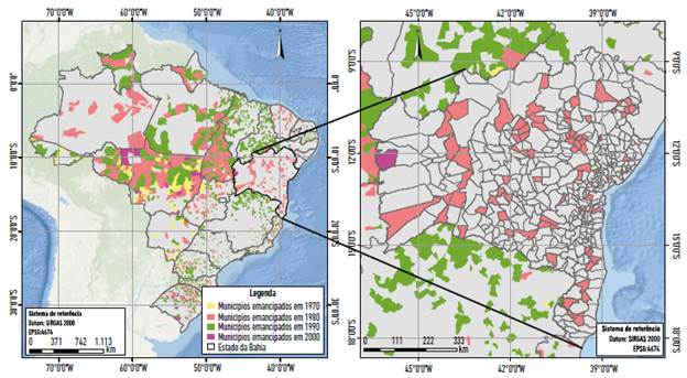 Figura 2: Evolução das emancipações entre 1970 e 2000 e a distribuição pelo território brasileiro, com destaque para o Estado da Bahia.