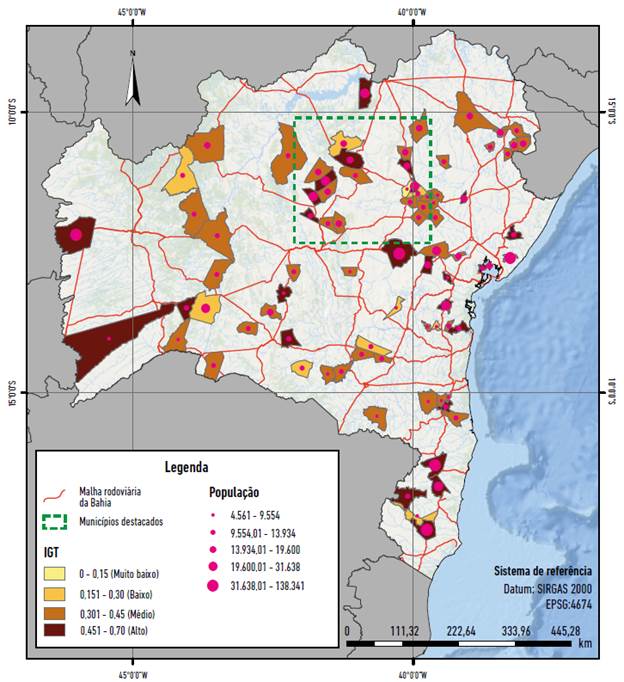 Nenhum município conseguiu obter o índice muito alto, superior a 0,70. Mesmo assim, municípios como Teixeira de Freitas, Eunápolis, Jucuruçu, Itabela, no extremo sul; LEM, Jaborandi e São Félix do Coribe, no oeste; Ourolândia, João Dourado, Lapão e Sobradinho, no centro norte, se destacaram com os melhores desempenhos. Estes últimos estão localizados na região semiárida da Bahia, que vem sendo duramente atingida pela pior estiagem dos últimos cinquenta anos e que, historicamente, é a região com maior injustiça territorial da Bahia.