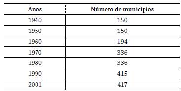 Conforme Tabela 1, no Estado da Bahia o número de municípios passou de 150 em 1940, para 417 em 2001, sendo que a maior quantidade de emancipações ocorreu nos anos de 1960 e 1970, com a criação de 142 municípios; e entre 1980 e 1991, com 79 emancipações. São localidades com populações que variam de 4.561 a 138.341 habitantes.