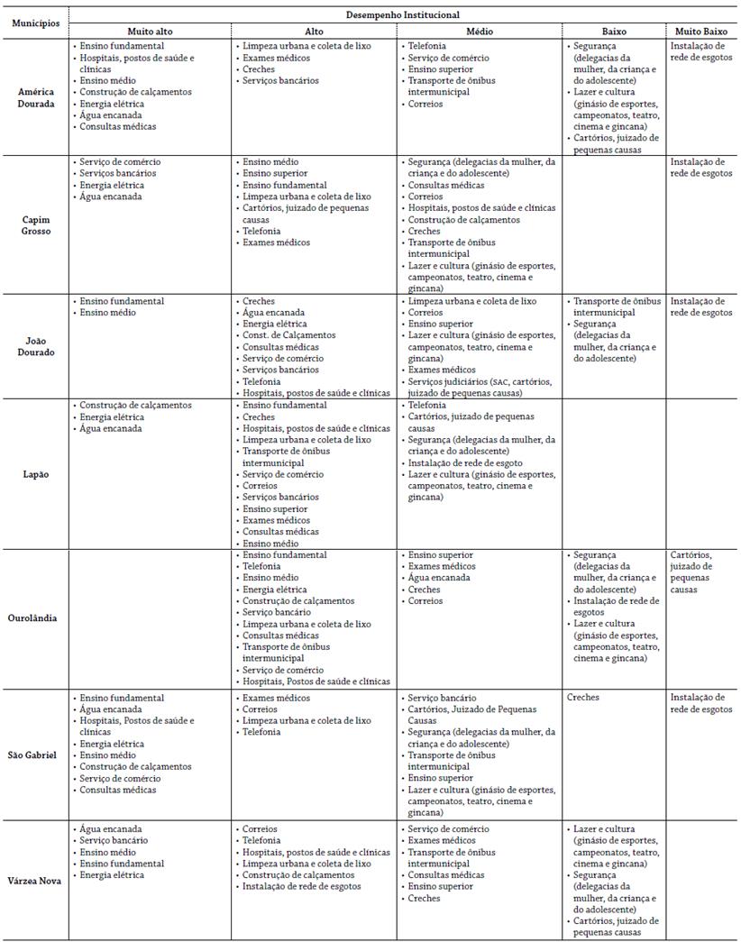 A partir das pontuações, foi construído um quadro tipológico síntese (Tabela 2) para cada município analisado no trabalho de campo, contendo o desempenho institucional de cada serviço, segundo as informações das lideranças locais. As pontuações apresentadas hierarquicamente foram classificadas qualitativamente, como desempenho institucional muito alto, alto, médio, baixo e muito baixo. Como pode ser visto no Tabela 2, o desempenho institucional variou conforme os tipos de serviços oferecidos. Entre os que obtiveram desempenho muito alto (América Dourada, Capim Grosso, São Gabriel), a oferta de ensino fundamental e médio, serviço de comércio, a construção de calçamentos e o oferecimento de água encanada se destacaram.