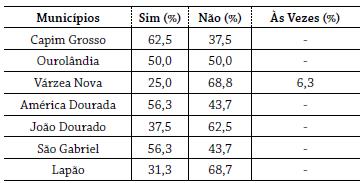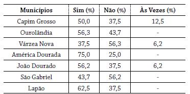 Por outro lado, quando foi perguntado se participaram de algum conselho municipal, 62% das lideranças de Capim Grosso e 56% de América Dourada responderam que sim, enquanto as lideranças que menos participaram dos conselhos foram as de Várzea Nova, com 68,8%, Lapão com 68,7% e João Dourado com 62,5%. Ou seja, esses dados apontaram para uma população mais engajada, quantitativamente, em Capim Grosso e América Dourada. E menos engajada em Várzea Nova e Lapão (Tabela 4).