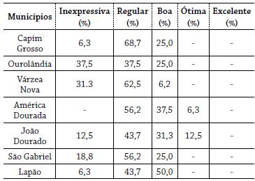 Finalmente, foi perguntado se a população tinha consciência da importância em participar dos programas e projetos do governo municipal. Nesse caso, prevaleceu um nível de conscientização regular, inclusive em Capim Grosso e Várzea Nova (Tabela 5). A maior conscientização foi identificada em Lapão e a menor foi em Ourolândia. Nesse município, inclusive, nenhum serviço alcançou um desempenho institucional muito alto.
