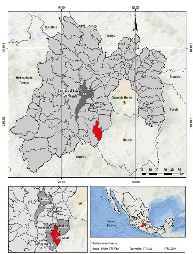 Ubicado a 19°57'07" de latitud norte y a los 99°30'06" de longitud del Meridiano de Greenwich en la República Mexicana, en el centro del país, en el Estado de México se encuentra Malinalco, (Figura 3) su nombre proviene del náhuatl y traduce: "Donde se adora a Malinalxóchitl, flor de malinalli". Limita al norte con los municipios de Joquicingo y Ocuilan, al sur con el municipio de Zumpahuacán y el estado de Morelos, al este con el municipio de Ocuilan y el estado de Morelos, y al oeste con los municipios de Tenancingo y Zumpahuacán (Schneider 1999).