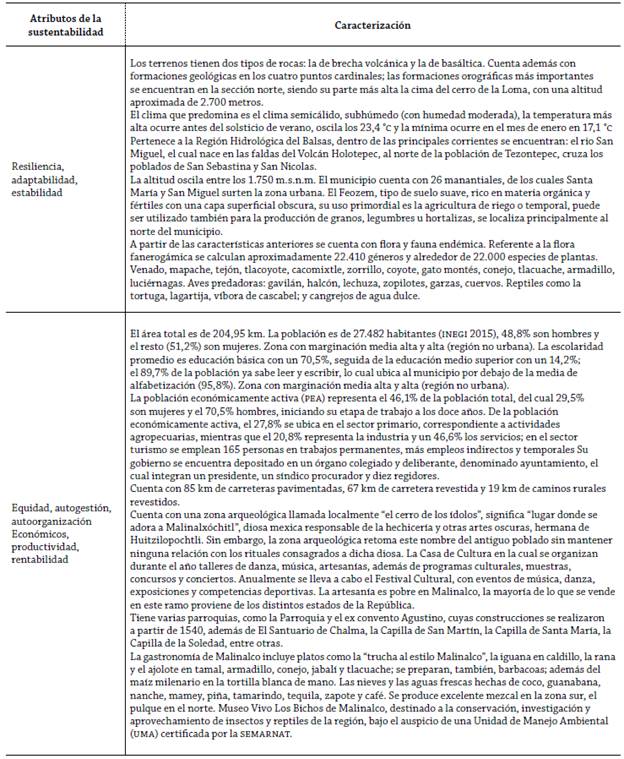 En la Tabla 6 se muestra la caracterización detallada de Malinalco, para describir cada característica se utilizaron los atributos de la sustentabilidad, al igual que en el caso de Santa Fe de Antioquía.