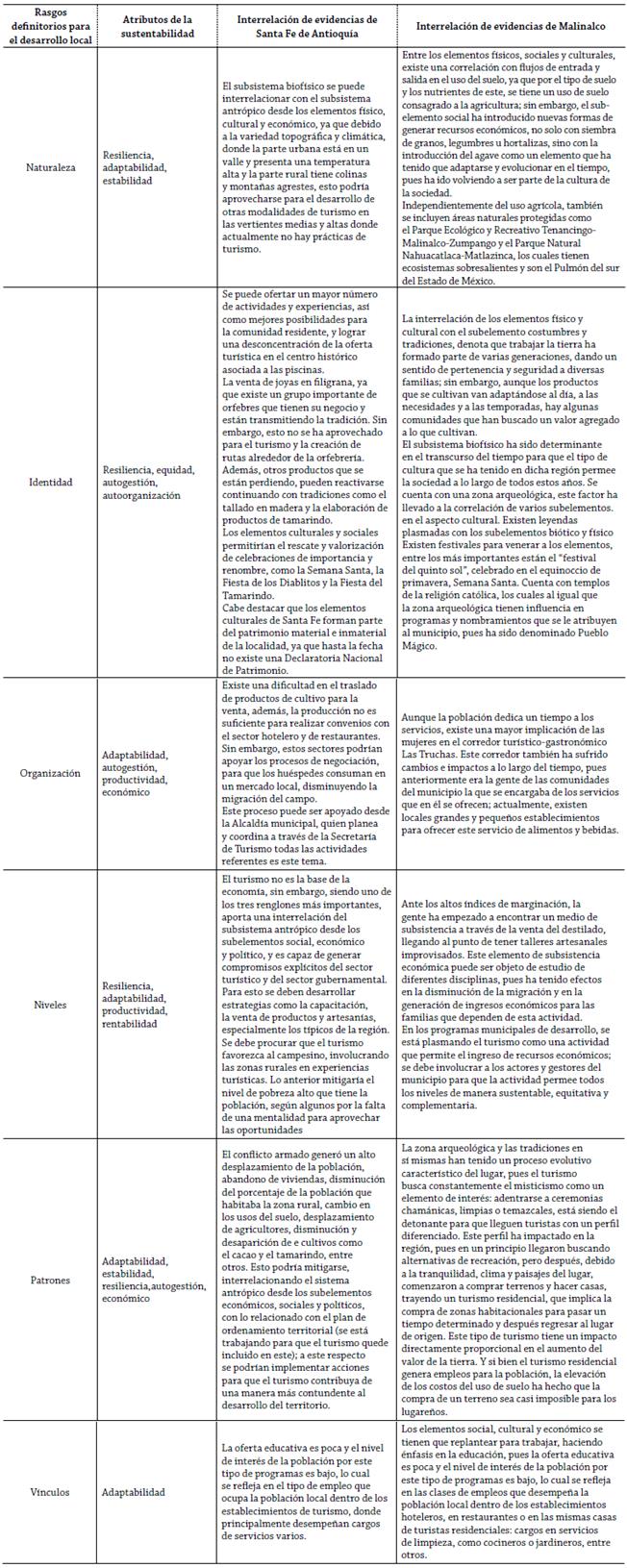 El análisis se propicia a partir de la interrelación de las evidencias, a la luz de los atributos de la sustentabilidad. La Tabla 7 muestra el resultado del diagnóstico generado a partir de la interrelación de los elementos caracterizados. Ahora bien, a la Tabla 4 se le agregó una columna para identificar los rasgos que definen el desarrollo local, ya que esto permite visualizar qué puntos se deben trabajar para que la interrelación de todos los elementos del sistema propicien el mejoramiento de la calidad de los recursos naturales y de la vida misma.
