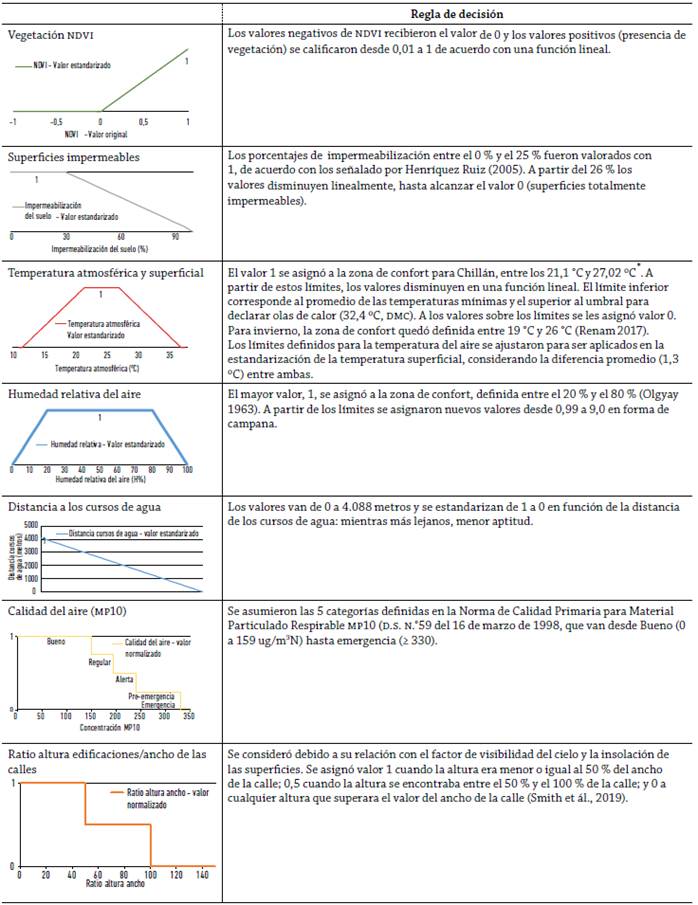 Las variables de entrada se estandarizaron en una escala de 0 a 1, asociado al grado de adecuación respecto del objetivo, que corresponde en este caso a la calidad climática. Para ello se utilizó la aplicación de escalamiento del software ArcGiS 10.4, de acuerdo con funciones de transformación y puntos de control a partir de umbrales definidos por la literatura o normativa (Tabla 2).