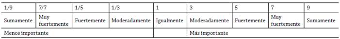 Para definir el peso de los factores (wj) se utilizó la metodología de proceso de jerarquía analítica propuesta por Saaty (1980). Mediante esta técnica se evalúa la importancia por pares de factores, utilizando la escala propuesta por el autor, que va de 1/9 a 9 (Tabla 3). A partir de esta metodología se obtiene el grado de importancia o peso de cada factor. Para controlar que la asignación de juicios de valor sea correcta, se calculó la razón de consistencia (consistency ratio, c. r.): valores inferiores a 0,1 se consideran aceptables.