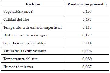 De la consulta a expertos sobre factores incidentes en la calidad climática, la vegetación posee la mayor ponderación promedio, el 19,7 %. En segundo lugar aparece la calidad del aire, con el 17,5 %, y en tercer lugar la temperatura de emisión superficial, con el 14,3 %. El resto de los pesos se aprecian en el Tabla 6.