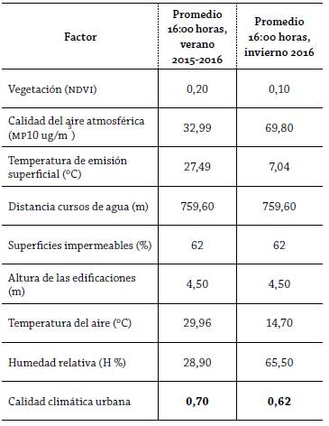 Los valores de calidad climática urbana se extienden entre 0,1 y 0,9, aproximadamente. El promedio de calidad climática urbana se encuentra entre 0,6 y 0,7. La configuración espacial de la calidad climática en la ciudad, calculada con el promedio del verano 2015-2016, en general, es similar a la observada durante el día de medición evaluado (30 de enero de 2016).