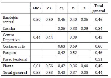 El valor de la calidad climática urbana obtenida en Chillán se relaciona con el nivel socioeconómico. El promedio de calidad climática es mayor en las zonas de la ciudad donde habita la población ABCI: las macrozonas en que este nivel socioeconómico se presenta poseen buena calidad climática, con valores que superan los 0,6, versus los valores restantes, que se encuentran en torno a 0,4. Si bien se plantea que los espacios públicos podrían contrarrestar las diferencias anteriores, ofreciendo buenas condiciones ambientales y climáticas a la población, se observa que la calidad climática al interior de los espacios públicos asociados a NSE ABCI gozan de mayor calidad climática. En los sectores donde vive población predominantemente del nivel ABCI solo se encuentran parques y bandejones centrales, principalmente vegetados, lo que se demuestra con los mayores valores del NDVI. Las canchas de fútbol son una tipología de espacios públicos bastante numerosa, y todas ellas se ubican asociadas a población de ingresos medio-bajo, pertenecientes a los niveles socioeconómicos C3 y D. Las cubiertas de las canchas de fútbol son en todos los casos de pavimento o tierra, y corresponde a una tipología que requiere una baja inversión y menos mantención que un parque o plaza, lo que podría explicar que se prefiera su instalación sobre otros espacios públicos.