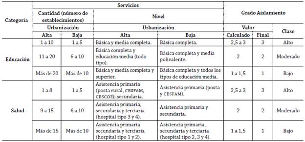 Tabla 4: Clasificación del Grado de Aislamiento de las categorías de servicios públicos presentes a nivel comunal