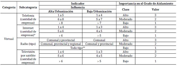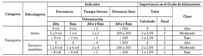 Cada indicador cuantitativo y cualitativo es asociado a un valor y clase, de acuerdo con su importancia para la definición de las categorías del grado de aislamiento (Alto 3, Moderado 2 y Bajo 1) (Tablas 5 y 6).