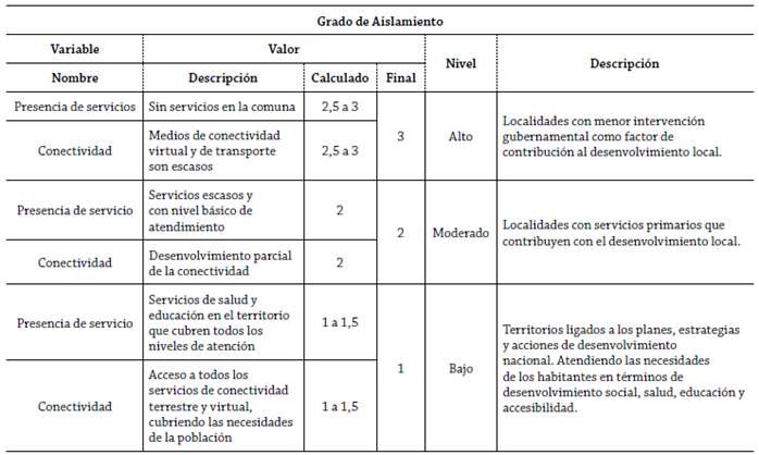 El nivel de aislamiento fue calculado utilizando métricas basadas en datos secundarios, y teniendo siempre como premisa la necesidad de contacto con otras comunidades y localidades urbanas. Dicha premisa parte de la idea de que la mayor conectividad y existencia de servicios implica un mayor desarrollo local.