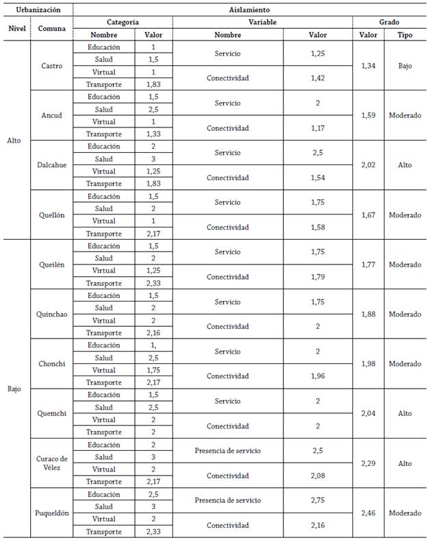 The identification of the isolation degree of an island territory becomes relevant for the management and planning of a geographical space. This study identifies and compares the isolation degree in insular territories. To this end, we worked with 10 communes in the province of Chiloé (Chile), being these the spatial units of analysis. It was applied a methodology based on the SUBDERE proposal in 2012, where the used variables are the presence of public services (education and health) and connectivity (transport and virtual communication). This methodology can be applied in other insular regions, considering the possibility of requiring the incorporation of other variables associated with the economic dimension and the perception of the population to be studied. As a result, the research shows that among the analyzed communes, the most isolated are Puqueldón, Curaco de Vélez, Dalcahue, and Quemchi, being the access to connectivity the main variable. Finally, it is determined that isolation plays an important role in the development of the socio-territorial activities of the population.