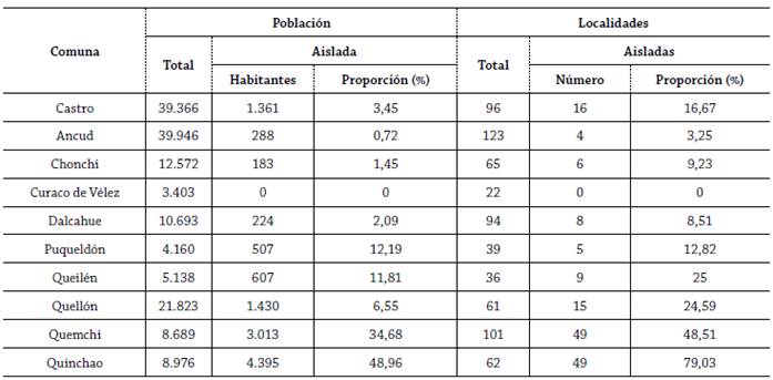 Tabla 9: Población y localidades aisladas en las diferentes comunas de la provincia de Chiloé