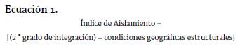 El índice de aislamiento resulta del análisis conjunto del "grado de integración" y de las "condiciones geográficas estructurales" del territorio. El grado de integración de mayor importancia en el análisis es aquel asociado al acceso a la oferta de educación, salud y a centros proveedores de otros servicios. Las "condiciones geográficas estructurales" se relacionan con las condiciones de accesibilidad a los centros políticos-administrativos, físicos-ambientales y de centralidad (tipo de camino, distancia y tiempo de traslado de un sujeto) (Ecuación 1).