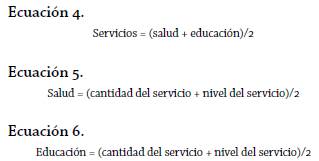 Los servicios de salud y educación se miden a través de las características de 2 indicadores: "cantidad de servicios públicos" y "nivel de los servicios" en la comuna (Tabla 4). El "nivel de los servicios" en cada comuna se determina a través de la sumatoria de los resultados de los indicadores de "salud" y "educación" (Ecuaciones 4, 5 y 6).