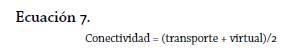 La variable "acceso conectividad" considera características de los medios de transporte terrestre-marítimo y aéreo, así como de conexión virtual de telefonía, radio, televisión e Internet existentes en las comunas. El impacto que genera la conectividad en una comuna es determinado a través de la sumatoria de las categorías "medios de transporte" y "conexión virtual" presentes en el territorio (Ecuación 7).