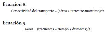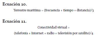 El "acceso a la conectividad" con base en los "medios de transporte" considera las subcategorías "aérea y terrestre-marítimo" (Ecuación 8) y los indicadores de "frecuencia", "distancia" y "tiempo" que presentan en cada espacio comunal. La "frecuencia" es definida como el número de viajes por semana (aéreos) o diarios (terrestre-marítimo) de la ciudad capital de la comuna hasta la ciudad capital regional. La "distancia" es considerada como la separación, medida en kilómetros, entre la ciudad capital de la comuna hasta la ciudad capital regional. El "tiempo" es el periodo necesario para recorrer el trayecto entre la capital de la comuna hasta la ciudad capital regional (Ecuaciones 9 y 10). Por otro lado, el acceso a la conectividad con enfoque en la "conexión virtual" presente en el territorio utiliza como indicador la influencia que generan las subcategorías de "telefonía", "Internet", "radio" y "televisión" en la comuna (Ecuación 11).