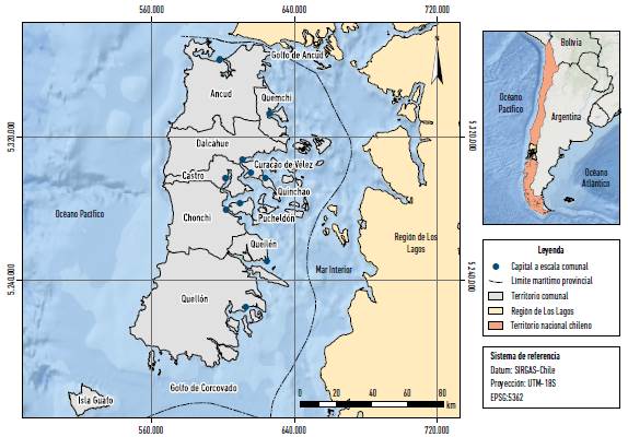La provincia de Chiloé se localiza en la Región de Los Lagos (Chile) frente a la costa meridional del país, entre el océano Pacifico, el canal Apiao, y los golfos de Ancud y Corcovado, comprendiendo un archipiélago formado por 40 islas menores posicionadas en el mar interior y la isla Grande de Chiloé (Figura 1). La capital provincial es la ciudad de Castro, localizada a 88 km al sur de la capital regional (Puerto Montt) y a 1.198 km de Santiago, capital del país. La provincia comprende las comunas de Ancud, Castro, Quemchi, Dalcahue, Quellón, Curaco de Vélez, Puqueldón, Chonchi, Queilén y Quinchao, representando una extensión territorial de 9.181 km2 (18,9% del territorio regional).